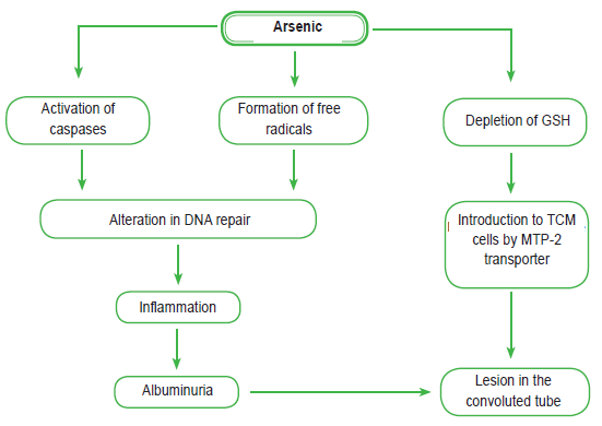 The MRP-1 and 2 (ATP binding cassette-multidrug resistance protein) are another group of As transport proteins in the liver, where they transport the As conjugated with GSH to the bile. The MRP-2 transporter is also located in the cells of the proximal tubule, which favors the introduction of As into these cells.19 The toxicity of As in PCT cells is due to the depletion of GSH and the increase in the oxidative activity of free radicals (Figure 2).