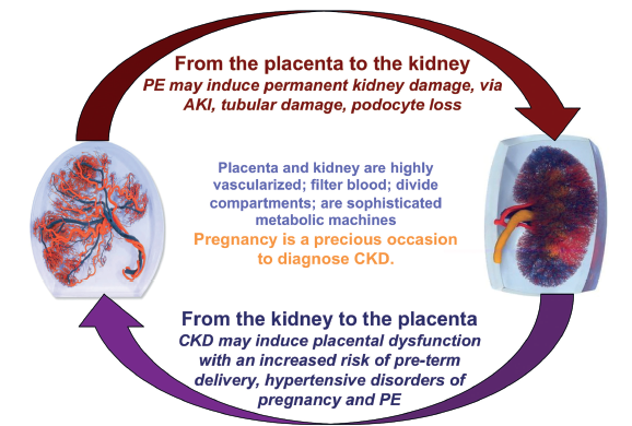 Pregnancy is a unique challenge and is a major cause of acute kidney injury (AKI) in women of childbearing age; AKI and pre-eclampsia (PE) may lead to subsequent CKD, but the entity of the risk is not completely known2-5. CKD has a negative effect on pregnancy even at very early stages6-7. The risks increase with CKD progression thus posing potentially challenging ethical issues around conception and maintaining of pregnancies6-8. We do know that PE increases the probability of hypertension and CKD in later years, but we have not evaluated a surveillance or reno-protective strategy to determine if progressive loss of kidney function can be attenuated9-12.