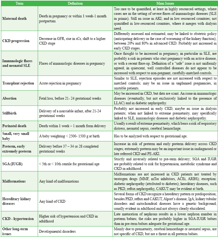 Hypertension and proteinuria at baseline are important modulators of pregnancy-related risks; among the risks, we know that malformations are not increased with respect to the overall population (out of the context of inherited diseases, such as reflux nephropathy, polycystic kidney disease, or congenital anomalies of the kidney and urinary tract), maternal death is unusual (in highly resourced countries), while the incidence of preterm delivery and of small for gestational age babies, intrinsically linked, is increased in stage 1 CKD patients, and rises with the worsening of kidney function. Likewise, the effect of pregnancy on CKD progression is not fully understood because of different study designs, obstetric policies, and duration of follow-up. Overall, short- and long- term decrease in kidney function is unusual in early CKD, but the risk increases as CKD severity increases6,7,38-41,44-48.