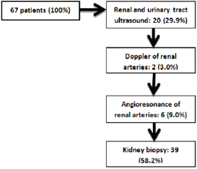 Of the total of 67 participants in the study (figure 1), 28 were diagnosed by imaging studies. By renal and urinary tract ultrasound, 11 patients with hypertensive nephropathy, 4 obstructive nephropathies, 2 chronic pyelonephritis, 1 chronic NSAID nephritis, 1 unilateral renal atrophy, and 1 unilateral renal agenesis were identified. The renal vessel Doppler identified 2 patients with chronic ischemic nephropathy. Finally, by angioresonance of renal arteries, 6 patients with renal artery stenosis, unilateral in 5 patients and, in 1 patient, bilateral. On the other hand, 39 patients (58.20% of the population) underwent renal biopsy, given that by the previous methods a satisfactory diagnosis was not achieved.