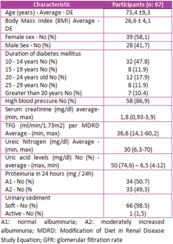 The urinary sediment was soft in 98.5% of the patients and, in the measurement of proteins in urine of 24 hours; it was found that 50.75% had normal albuminuria (A1). In addition, in 49.3% moderately increased albuminuria (A2), according to the classification recommended by the KDIGO guidelines15.