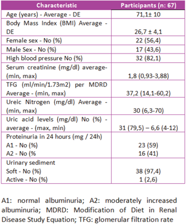 According to the above, 35 patients were excluded: 17 for incomplete studies, 11 lost during follow-up, 3 were admitted to hemodialysis-type renal replacement therapy, 1 to peritoneal dialysis, 3 patients had proteinuria greater than 300 mg in 24 hours, detected in previous years when reviewing medical records. In total, 67 patients finally met the inclusion criteria for this case series study.