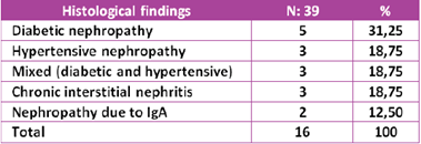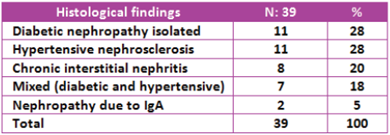 The histological findings were: isolated diabetic nephropathy in 28% of the cases (11 patients); hypertensive nephrosclerosis, 28% (11 patients); chronic interstitial nephritis, 20% (8 patients); mixed, diabetic and hypertensive nephropathy, 18% (7 patients); and IgA nephropathy in 5% of cases (2 patients) (Table 3).