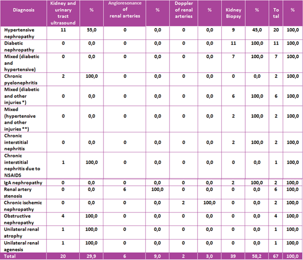The consolidated diagnosis obtained by imaging and renal biopsy can be reviewed in (Table 4).