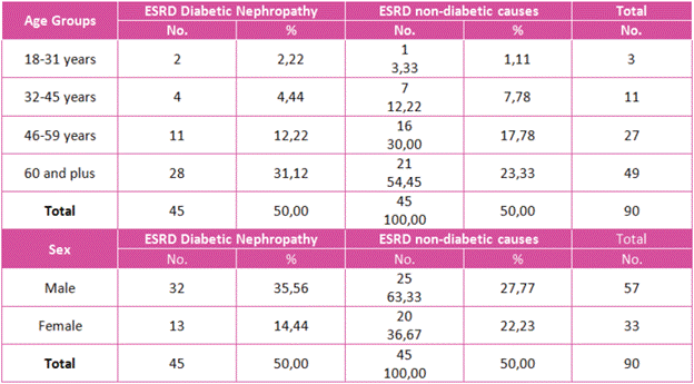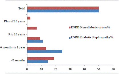 Methodology: The descriptive study of cohort of 174 hemodialysis patients (stage 3b, 4 and 5) was performed. A sample of 90 patients, including diabetics and non-diabetics, was studied, considering inclusion, exclusion, and exit criteria. The survey was the primary source of information and clinical records of patients on hemodialysis were the secondary source. Age, sex, comorbidity, time on hemodialysis, nutritional status, type of vascular access, number of attempts at attaining vascular access, complications resulting from hemodialysis, and factors impeding the realization of a kidney transplant in diabetic patients, were the variables studied.