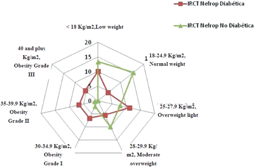 In Figure 3, in relation to the patients studied according to the Nutritional Status, a greater number of lightweight overweight cases (11.12%) was observed in the diabetic population (ESRD with ND), followed by patients with low weight (10%). of this population). Some cases of obesity are notable.