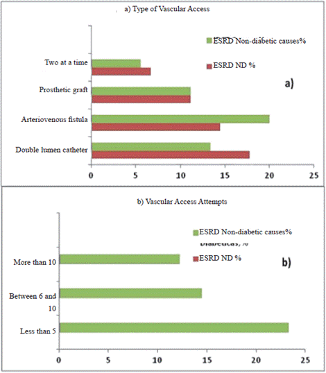 Figure 4a refers to the distribution of patients studied according to type of VA. A greater number of diabetic patients are shown with double lumen intravascular catheter (17.76%), in relation to the prevalence of patients with arteriovenous fistula in non-diabetics (20.00%).
