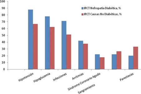 The complications that most frequently occurred in the case of chronic kidney disease due to diabetic nephropathy were: arterial hypotension, hypoglycemia and infections. In non-diabetics they were predominant, with a significantly lower percentage, hypotension and infections. The cardiovascular disease and the extreme ages of the patients invalidated, to a greater extent, the kidney transplant in both groups.