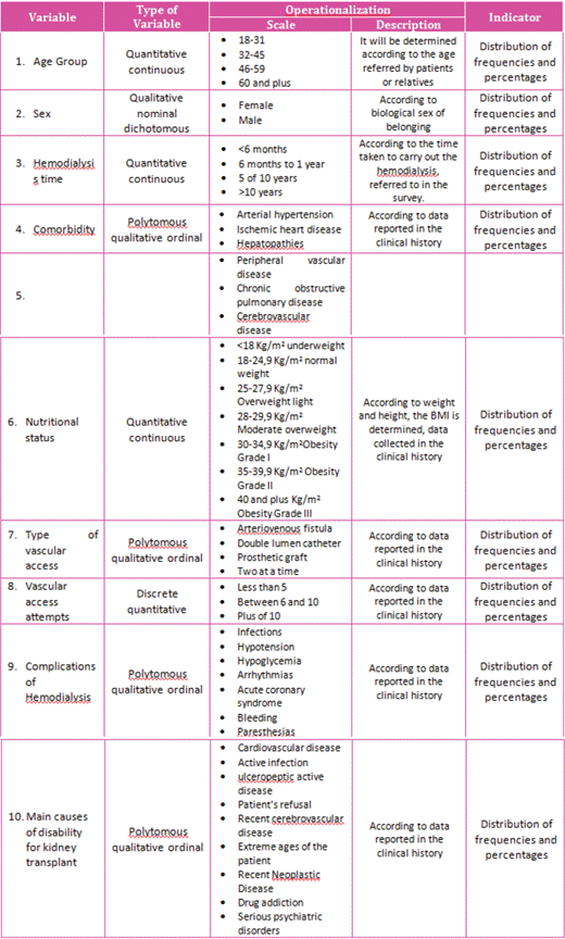 The primary data for the investigation was obtained from the Nephrology Service database. The primary source for obtaining the information was the survey, made according to criteria of objectives. The secondary source was formed by the clinical histories and the banners of the hemodialysis patients. The following variables were considered in the survey: