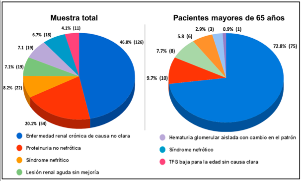 En los pacientes mayores de 65 años, los hallazgos más frecuentes fueron nefropatía hipertensiva (33 %, 34), NTI (17,5 %, 18), glomerulopatía diabética (10,7 %, 11), NIgA (8,7 %, 9), biopsia normal (6,8%, 7), GEFS (6,8 %, 7), GNPE (3,9 %, 4), GMNM (2,9 %, 3), GMNMP (2,9 %, 3), glomerulonefritis crónica (2,9 %, 3), amiloidosis (2,9 %, 3) y otras causas (0,97 %, 1).