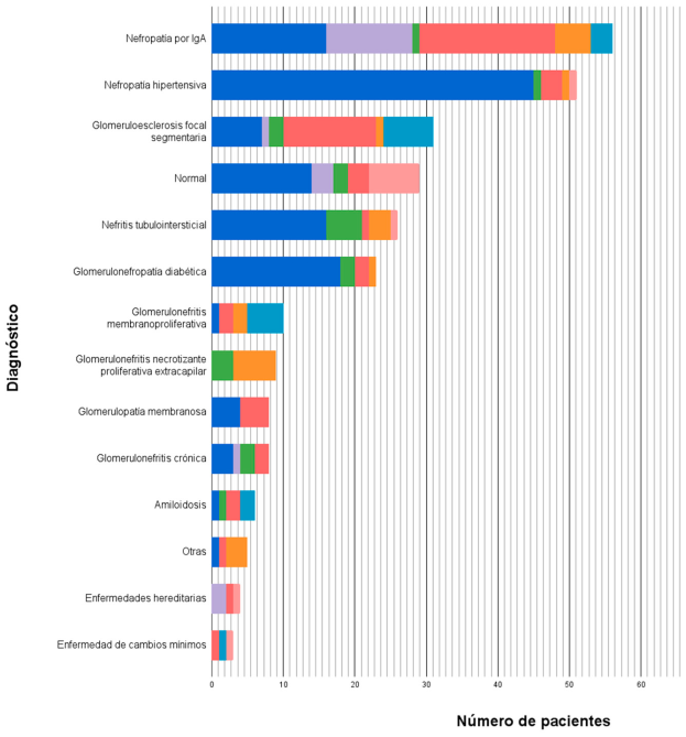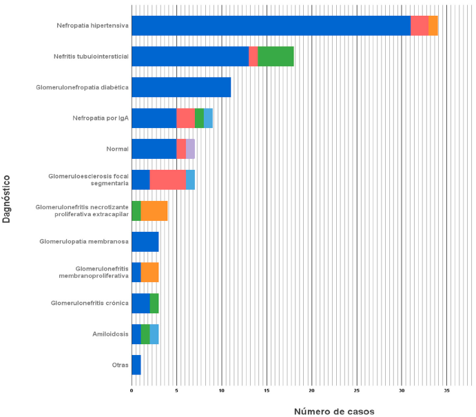 Los hallazgos histológicos más frecuentes fueron: nefropatía por inmunoglobulina A (NIgA) (20,9 %, 56 pacientes), nefropatía hipertensiva (19 %, 51), glomeruloesclerosis focal segmentaria (GEFS) (11,6 %, 31), biopsia normal (10,8 %, 29), nefritis tubulointersticial (NTI) (9,7 %, 26), glomerulopatía diabética (8,6 %, 23), glomerulonefri-tis membranoproliferativa (GMNMP) (3,7 %, 10), glomerulonefritis proliferativa extracapilar (GNPE) (3,4 %, 9), glomerulonefritis crónica (3 %, 8), glo-merulonefritis membranosa (GMNM) (2,6 %, 7), amiloidosis (2,2 %, 6), enfermedades hereditarias (1,5 %, 4), enfermedad de cambios mínimos (ECM) (1,1 %, 3); y otras causas (1,8 %, 5), entre las que se encuentran nefropatía por inmunoglobulina M, glomerulonefritis mesangioproliferativa y glomeru-lopatía fibrilar.
