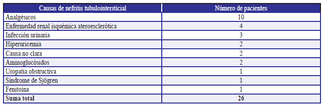 Como se describe en la literatura25, la principal causa de NTI en este estudio fueron los analgésicos asociados al manejo de enfermedades articulares (38,8 %). La enfermedad renal isquémica y ateroesclerótica más común en personas de edad avanzada ocupó el segundo lugar (15,3 %).
