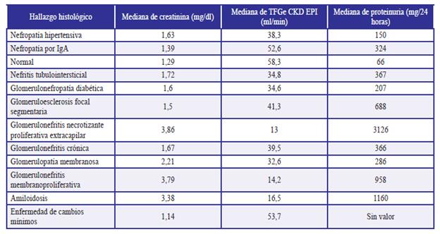 Hubo 3 casos de GMNMPde etiología secundaria, 2 casos asociados a enfermedad autoinmune (crioglobulinemia y síndrome de Sjogren) y 1 caso asociado a proceso neoplásico. La GMNPE fue la principal causa de síndrome nefrítico (27,2 %). De los 9 casos, 7 tenían causa pauciinmune, 1 por inmunocomplejos y 1 sin dato. De la GMNM, 7 casos correspondieron a etiologías primarias y 1 a causa secundaria relacionada con autoinmunidad. De los 6 casos de amiloidosis, 4 correspondían a amiloidosis tipo AL (2 por mieloma múltiple) y dos casos a formas primarias (AA y otra no determinada). Los 4 casos de enfermedades hereditarias correspondieron a enfermedad por membrana basal delgada. En la categoría de otras enfermedades glomerulares, hubo 2 casos de nefropatía por IgM, 2 casos de GMN mesangioproliferativa y 1 caso de glomerulopatía fibrilar. En la tabla 2, se describen las medianas de creatinina, TFG y proteinuria en 24 horas para cada hallazgo histológico.
