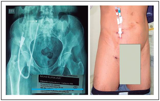 The procedures were done under aseptic conditions and with local anesthesia in the skin a tissue over the territory of the vascular-nervous complex femoral. The femoral vein was punctured, guide wire was passed and left in the vessel lumen and the needle was removed. Then we applied local anesthesia in the supra-inguinal region, in a horizontal trajectory of 2 cm, and about 10 cm distant of the vein puncture site. Then we applied local anesthesia along the trajectory from de supra-inguinal region until venous puncture site. With a scalpel, an incision was made in the supra-inguinal area and a subcutaneous tunnel was made advancing a tunneler from the incision to the exit site of wire guide, the catheter was introduced in the tunnel joined to the tunneler. Over the guide wire the vein was dilated with 12 French and 14 French dilators, then a 16 French Valved Pull-Apart Sheath/Dilator was advanced to the vein, the dilator was removed and the flexible catheter was advanced at time the sheath was removed. Patency was verified, the incisions were sutured and the catheter was fixed to the skin of the anterior wall of the abdomen (figure 1,2).