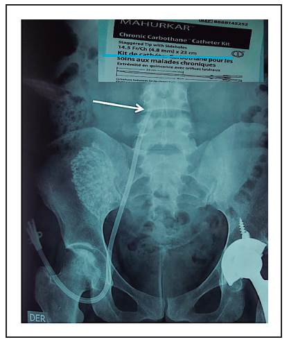 Often the catheter is located in inappropriate beds such as lumbar ascendant vein[14], hemyazigos accessory vein[15], is therefore important to verify the location of the tip with a simple plain radiography of the abdomen, mainly if the functioning is inadequate.
