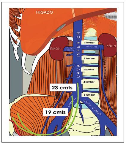 The radiographic control showed the 19 cm catheters tip between S1 and L5 (approximately iliac vein bed), meanwhile the 23 cm tip catheters was located between L3 and L4, area of the inferior cava vein (figures 1,2).