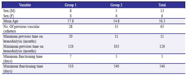 During 103 months (from February 2009 to September 2017), 30 femoral tunneled catheters were implanted in 19 patients; 15 each group, mean age was 56.3 years. Thirteen (68.4%) were men.
