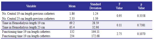 There were no differences for numbers of previous catheters, hemodialysis time and functioning time between both groups, the table 2 shows the 'F' Value, with the respective "p" value, all superior to cutting point (table 2).