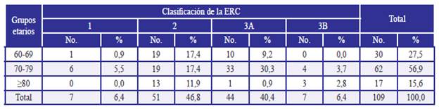 En la tabla 1 se presenta la información relativa a las variables grupos etarios y clasificación de la ERC. De los 109 pacientes investigados, se evidencia un predominio en los estadios 2, con 51 pacientes (46,8 %) y 3A, con 44 (40,4 %), en tanto que los 14 restantes clasificaron de manera equitativa entre los estadios 1 y 3B, mientras no hubo pacientes en los estadios 4 y 5. Al relacionar la clasificación de la ERC con la edad, se aprecia que las mayores contribuciones o aportes relativos de efectivos poblacionales se concentran en el grupo de edad de 70 a 79 años, al que pertenecía el 56,9 % de los estudiados; en este también predominaban los pacientes consignados en el estadio 3A, que constituye el 30,3 % del total. Sin embargo, la prueba X2 para la regresión realizada no resultó significativa (p>0,05), por lo que no existen evidencias suficientes para plantear asociación entre la edad y la evolución de la enfermedad, con confiabilidad de 95% en la presente muestra.