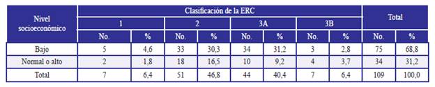 Materiales y métodos: estudio observacional, descriptivo y transversal realizado en los consultorios del Programa Médico y Enfermera de la Familia 13, 14 y 42 en el Consejo Popular Entronque de Pilotos. El universo fue de 389 pacientes y la muestra final de 109. Se analizaron las variables edad, sexo, color de piel, escolaridad, nivel socioeconómico, clasificación de la ERC y redes de apoyo familiar y social. Se utilizó la fórmula Modification of Diet in Renal Disease abreviada para determinar el grado de la enfermedad. Para darle salida se utilizó la estadística descriptiva (frecuencias absolutas y relativas, prueba chi-cuadrado (X2) para la regresión y X2 Bartholomeus). Se tuvo en cuenta el consentimiento informado.