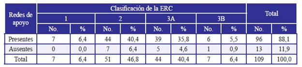 La distribución de los adultos mayores investigados según la presencia de redes de apoyo y clasificación de la ERC se presenta en la tabla 3. Así, la mayoría tenía redes de apoyo (96, para el 88,1 %). Sin embargo, no se encontró asociación significativa entre estas variables (p>0,05).