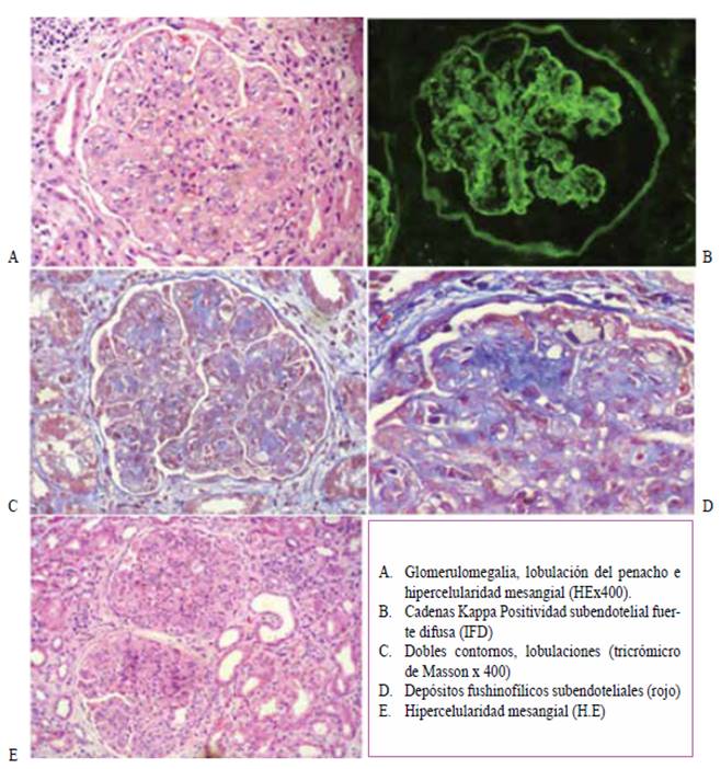16 glomérulos por corte, ninguno esclerosado, todos aumentados de tamaño, hipercelularidad mesangial, lobulaciones y dobles contornos, con depósitos fuschinofÍlicos subendoteliales. Sin spikes, ni semilunas. Leve infiltrado inflamatorio mononuclear intersticial. Sin fibrosis ni atrofia tubular. Arterias sin lesiones. IFD: Ig A neg, Ig G positividad granular subendotelial y mensangial fuerte y difusa. Ig M positividad granular subentdotelial débil. C3 positividad granular subendotelial y mesangial fuerte y difusa. C1 q negativa. Cadenas ligeras kappa positividad subendotelial fuerte y difusa. Cadenas ligeras lambda positividd subendotelial débil.