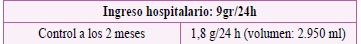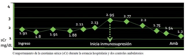 Con los hallazgos presentados en la biopsia renal y la historia clínica se consideró que el paciente cursaba con una GNMP asociada a crioglobulinemia mixta esencial (no asociada a VHC u otra causa identificable). Se inició tratamiento inductor inmunosupresor con pulsos de esteroides y ciclofosfamida, con los cuales su función renal y la proteinuria mejoraron ostensiblemente, con resolución de los edemas y descenso de la proteinuria desde 9 g hasta 1.8 g (Tabla 2) y de la sCr desde 2.95 mg/dL (pico máximo durante su estancia hospitalaria) hasta 1.2 mg/dL en el último control ambulatorio (Figura 2), y sin la necesidad de terapia de soporte renal. Los niveles séricos del complemento regresaron también a valores normales en control ambulatorio (C3: 65, C4: 12 mg/dl), y así mismo tuvo recuperación progresiva de la albúmina sérica.