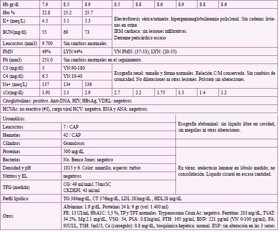 Con un enfoque inicial hacia enfermedades del aparato renal o cardiovascular, se iniciaron estudios diagnósticos (Tabla 1), que evidencian síndrome nefrítico con proteinuria en rango nefrótico y lesión renal aguda KDIGO 2 (descartándose causa cardiaca de su enfermedad actual), con hipocomplementemia, por lo que se ordenaron estudios pensando en enfermedades del colágeno, hematológicas, infecciosas, y se realizó biopsia renal.