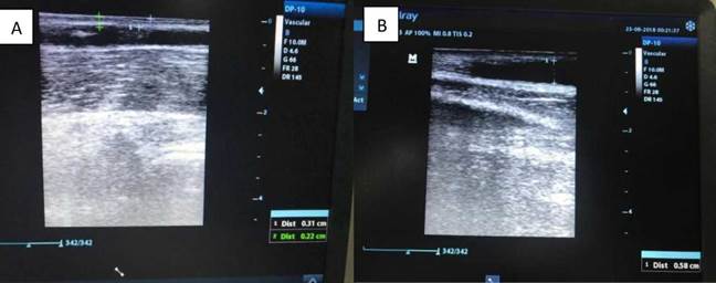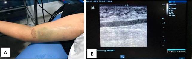 En el paciente 2, con fístula arteriovenosa humero cefálica, que llevaba 4 meses de construida y en el que, a pesar de este tiempo, la FAV nativa no había logrado una dilatación visible para poder ser canulada por su profundidad, al realizar la ecografía se observó que estaba a una profundidad de 1,03 cm, algo muy inusual en este tipo de fístula donde el trayecto cefálico es muy superficial. En ocasiones estas situaciones podrían sugerir o considerarse un fracaso de la maduración, el cual es un problema importante. De este modo, se define la falla temprana como una FAV que no se puede utilizar para diálisis o que falla dentro de los 3 meses de uso[8,9], y que además no correspondía a la situación de este paciente, ya que por ecografía se pudo visualizar un adecuado trayecto y diámetro de la vena. Por lo general, la FAV que no ha podido madurar tiene un problema anatómico de algún tipo que puede identificarse mediante un examen físico y confirmarse a través de imágenes.