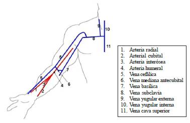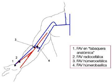 Es importante resaltar que tanto el personal médico como el de enfermería deben tener conocimiento de la anatomía de los vasos del miembro superior y el tipo de fístulas nativas que se pueden presentar en esta extremidad, los cuales se muestran en las Figura 5 y 6.