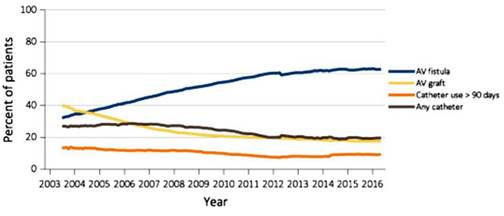 A mayo del 2016, en EE. UU el 62,7 % de los pacientes prevalentes en hemodiálisis estaban usando una FAV según datos del United States Renal Data System10] (figura 7).