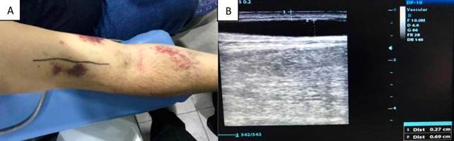 Una de las medidas recientes para mejorar y facilitar la canulación de las fístulas arteriovenosas (FAV) en hemodiálisis es el uso del ultrasonido[2]. La ultrasonografía para guiar la canulación se está generalizando, a pesar de la falta de una evidencia de alto nivel; incluso, en algunos escenarios el uso de ultrasonido se ha empezado a considerar como el estándar de atención para la implantación de catéteres de hemodiálisis[3], mejorando el porcentaje de punción exitosa. La implementación de esta técnica ha empezado a mejorar el porcentaje de canulación exitosa de las FAV, en el primer uso de la fístula, reduciendo la tasa de complicaciones en comparación con la canulación ciega[4].