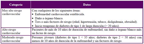 A finales de agosto de 2019 se publicaron las guías de diabetes, prediabetes y enfermedades cardiovasculares de la European Society of Cardiology, desarrolladas en conjunto con la European Association for the Study of Diabetes21. Un punto fuerte de estas guías es la categorización del riesgo cardiovascular, lo que permite favorecer el tratamiento integral de los factores de riesgo cardiovascular en personas con DT2. Un punto fuerte de las guías es la discusión orientada al manejo de los diferentes factores de riesgo cardiovascular como hipertensión, dislipidemia, ERC, cardiopatía coronaria, etcétera. Uno de los aspectos más notables que se relaciona a un cambio en el paradigma de tratamiento es el establecimiento de una clasificación de riesgo cardiovascular específica para personas con diabetes (tabla 1).