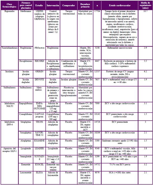 En los últimos años, se han realizado grandes ensayos clínicos controlados aleatorizados que han reportado disminución estadísticamente significativa en los eventos cardiovasculares, en general para los inhibidores SGLT2 (empaglifozina, canaglifozina y dapaglifozina) y para algunos agonistas GLP-1 (liraglutida, semaglutida y dulaglutida) en pacientes diabéticos con enfermedad cardiovascular aterosclerótica. El riesgo de hipoglucemia de estos medicamentos es bajo y cuentan con un adecuado perfil de seguridad.