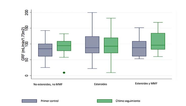 Se evaluaron tres esquemas terapéuticos de manejo: uso de prednisona en monoterapia; combinación de prednisona y mofetil micofenolato (MMF), y sin uso de prednisona ni de MMF. Adicionalmente, los pacientes pudieron recibir como manejo concomitante enalapril y/o aceite de pescado. La decisión terapéutica se tomó a discreción del médico tratante según las guías terapéuticas disponibles en el momento.