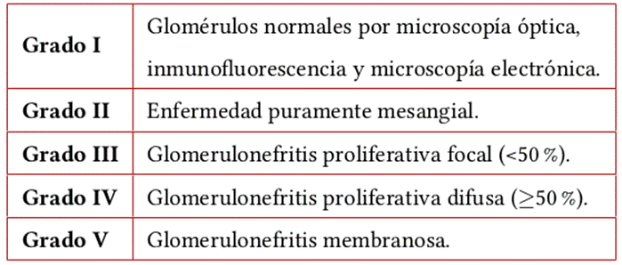 Se definió como proteinuria leve a la presencia en orina de proteínas entre 30 y 99 mg/dL, moderada entre 100 y 299 mg/dL y severa >300 mg/dL. Para el diagnóstico histológico se empleó el sistema de clasificación de la OMS (Tabla 1).