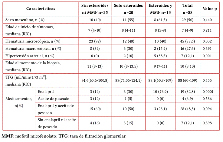 Materiales y métodos: estudio retrospectivo realizado en pacientes pediátricos de entre 1 mes y 18 años de edad con diagnóstico de NIgA. Las variables categóricas se presentaron como proporciones y las continuas con medianas y rango intercuartílico. Se usó la prueba de Fisher para comparar los tres esquemas de tratamiento.