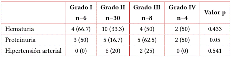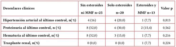 Los desenlaces clínicos según el grado de clasificación histológica de la OMS se muestran en la Tabla 4. Al último control la diferencia en la frecuencia de hematuria entre los grupos fue significativa (p>0,001), siendo mayor en el grupo que no recibió esteroides ni MMF (68 %), seguido del grupo que recibió solo esteroides (15 %) y, por último, el grupo que recibió esteroides y MMF (7,7 %). No hubo diferencias significativas en la frecuencia de proteinuria ni HTA entre los grupos.