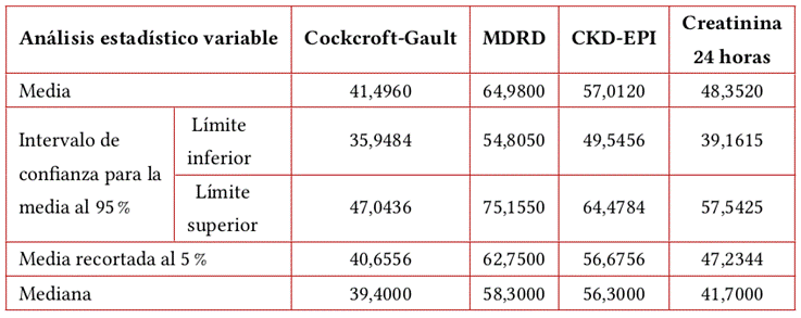 Para la variable Cockcroft-Gault se obtuvo un valor promedio de 41,49 mL/min/m2, con un intervalo de confianza de 35,9-47 mL/min/m2, siendo este el promedio más bajo de todas variables. En cuanto a la variable MDRD, se obtuvo un valor promedio de 64,9 mL/min/m2, con un intervalo de confianza de 54,8-75,1 mL/min/m2, siendo este el valor promedio más alto de todas las variables. Con la variable CKD-EPI, el valor promedio fue de 57,0 mL/min/m2, con un intervalo de confianza de 49,5-64,4 mL/min/m2. Finalmente, para el estándar de referencia, depuración de creatinina en 24 horas, el valor promedio fue 48 mL/min/m2, con un intervalo de confianza de 39,1-57,5 mL/min/m2, lo cual fue concordante con la variable Cockcroft-Gault.