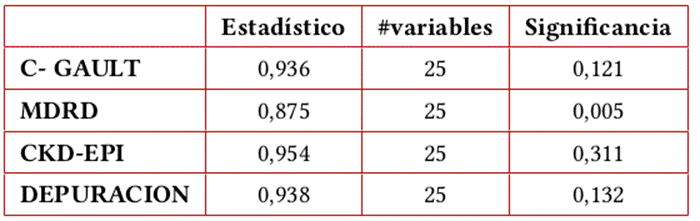 La prueba Shapiro-Wilk estableció que la distribución de las variables era normal, siendo la p>0,05 lo que indicó una adecuada correlación entre las diferentes fórmulas de TFG teniendo como estándar la depuración de creatinina en 24 horas (Tabla 2).