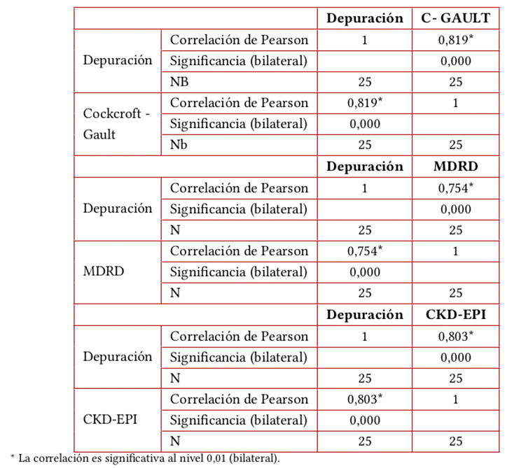 Dado que el valor p fue menor a 0,05, se establece que la evidencia estadística es suficiente para afirmar que existe correlación al medir las diferentes tasas de filtrado glomerular y la depuración de creatinina en recolección de orina de 24 horas, siendo la correlación del índice R de Pearson de 0,60-0,80 (Tabla 3).