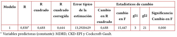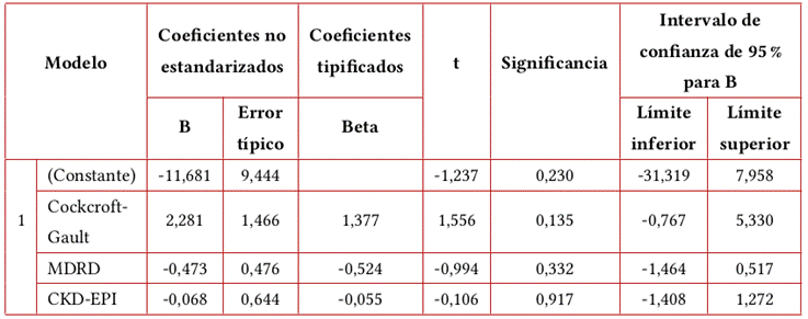 Mientras el coeficiente de determinación (R2) permitió hacer inferencia a la fórmula de Cockcroft-Gault, teniendo un 64 % (Tabla 4) de correlación, con la depuración de creatinina en 24 horas el análisis multivariado no mostró significancia estadística entre las tres fórmulas evaluadas (Tabla 5).