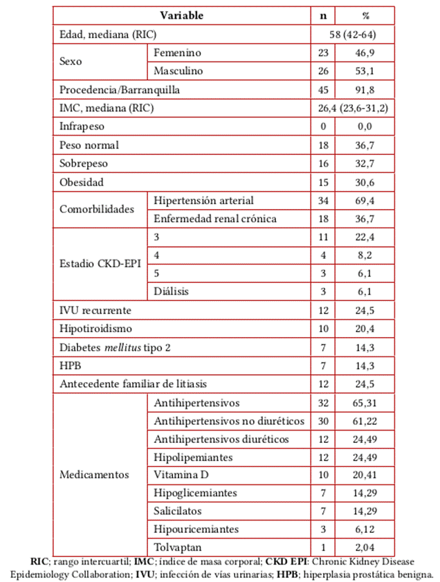 Resultados: el 53,1 % de los participantes eran hombres y las medianas de edad y de índice de masa corporal (IMC) fueron 58 años y 26,4 kg/m2, respectivamente. Algunas de las comorbilidades identificadas fueron, en orden de frecuencia, HTA (69,4 %), ERC (36,7 %), infección de vías urinarias recurrente (24,5 %), hiperuricemia (44,9 %), hipercalcemia (16,3 %) e hiperfosfatemia (12,2 %). Los tipos de cristal encontrados fueron oxalato (20,4 %), urato (12,2 %), mezcla de oxalato y urato (4,1 %), fosfato (4,1 %), hipercalciuria e hiperoxaluria (38,8 %), hiperuricosuria e hipocalciuria (18,4 %) y hipofosfaturia o hipofosfaturia (4,1 %). Asimismo, la hiperuricemia se asoció a edad (p=0,028), ERC (p=0,026), medicamentos antihipertensivos (p=0,022), posición del cálculo en cáliz renal (p=0,012), hiperparatiroidismo (p=0,007), depuración de creatinina (p=0,046) e hipercalciuria (p=0,049). El IMC ≥30 se asoció con ERC estadio 5 (p=0,025), diálisis (p=0,025) e hiperoxaluria (p=0,021).