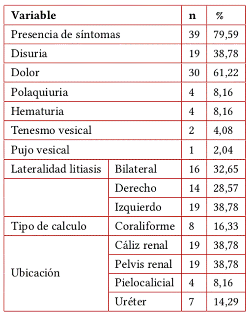 La mayoría de los participantes del presente estudio reportaron algún tipo de sintomatología, siendo los más frecuentes dolor y disuria; esto difiere a lo descrito por Pfau & Knauf6, quienes resaltan la presencia de hematuria macroscópica y microscópica en el 65-95 % de los casos de su estudio, lo que puede deberse a variaciones geográficas que determinan el tipo y tamaño del cálculo, y anatómicas que varían de acuerdo a cada paciente.