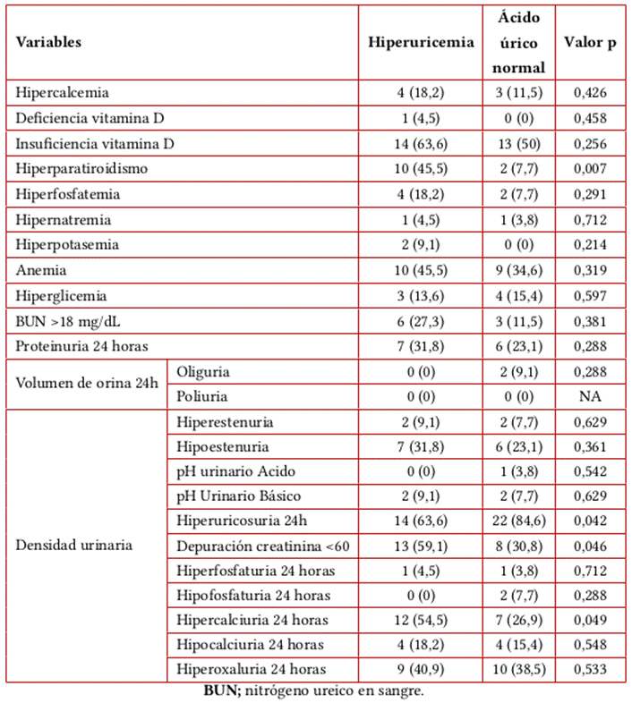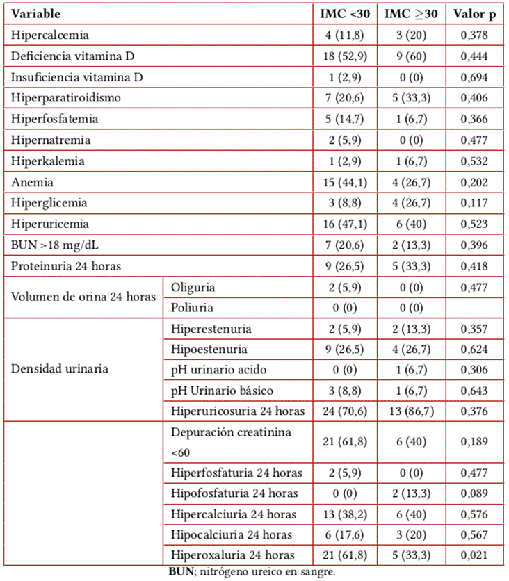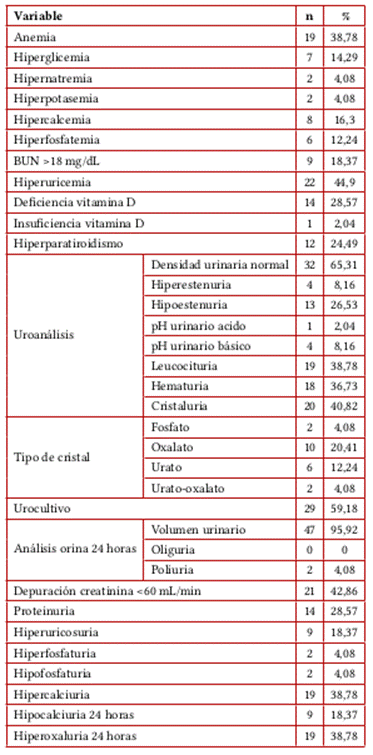 Se tuvieron en cuenta las siguientes definiciones: hipercalcemia: calcio sérico >10 mg/dL, hipercalciuria en 24 horas: calcio urinario >300mg/dL, hiperfosfaturia en 24 horas: fosforo urinario >1,3 g/dL, hiperuricosuria: ácido úrico urinario >1 g/dL, hiperoxaluria en 24 horas: oxalato urinario >30 mg/dL, hiperuricemia: ácido úrico sérico >7 mg/dL, hiperfosfatemia: fosforo sérico >5 mg/dL, deficiencia de vitamina D: vitamina D sérica 30-20 ng/dL, insuficiencia de vitamina D: <20 ng/dL, proteinuria 24 horas anormal: proteínas en orina de 24 horas >150 mg/dL, hipostenuria: densidad urinaria <1.010, hiperestenuria: densidad urinaria >1.030 y anemia: en hombres hemoglobina <13 mg/dL y mujeres hemoglobina <12 mg/dL.