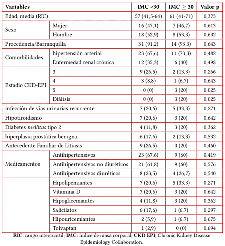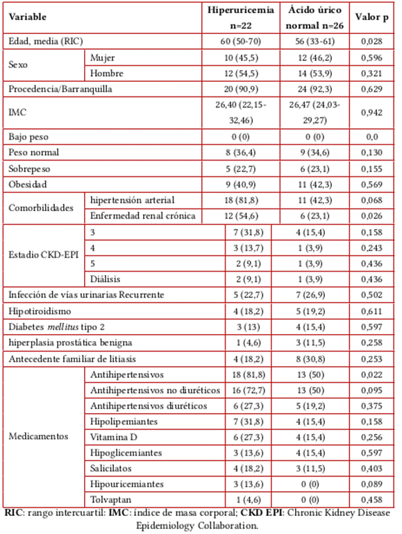 Introduction: Urolithiasis is a disease with high frequency and our environment is no exception. Previous studies have been published in Colombia, however, these do not compare the sociodemographic and clinical characteristics of patients with comorbidities and predisposing factors for lithiasis such as they are hyperuricemia, high blood pressure, obesity, and chronic kidney disease (CKD).
