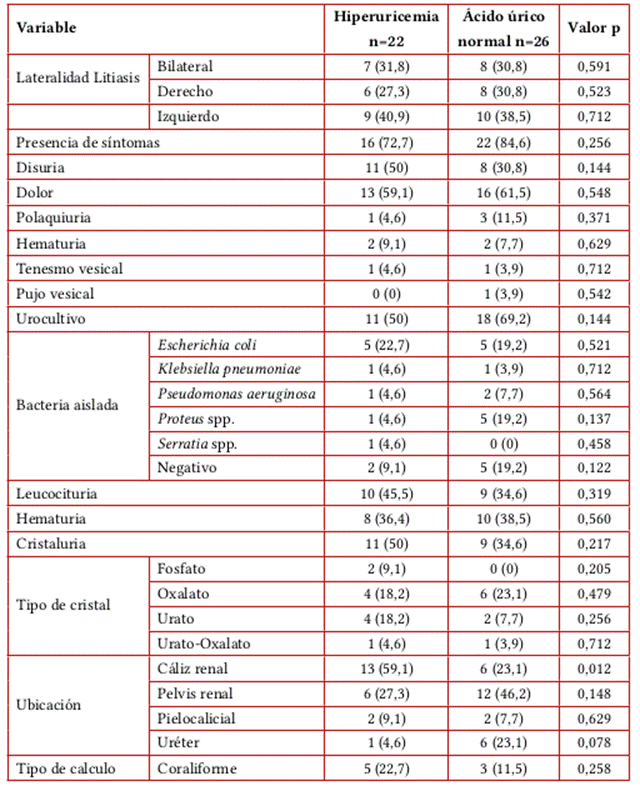 Al realizar un análisis comparativo la población se categorizó respecto a los niveles de ácido úrico, con lo cual se encontró que los pacientes con hiperuricemia tenían una mediana de edad de 60 años, mientras que la de los del grupo con ácido úrico normal era de 56 años (p=0,028). De la misma manera, se observó mayor frecuencia de ERC (p=0,026), uso de medicamentos antihipertensivos (p=0,022) y posición del cálculo en el cáliz renal (p=0,012) en el grupo con hiperuricemia (Tablas 4 y 5). Asimismo, al evaluar las características paraclínicas se estableció una diferencia estadísticamente significativa respecto al hiperparatiroidismo: 45,5 % en el grupo con hiperuricemia y 34,6 % en grupo sin la misma (p=0,007). La depuración de creatinina en 24 horas <60 mL/min (p=0,046) y la hipercalciuria en 24 horas también fueron más altas en el grupo de hiperuricemia (p=0,049) (Tabla 6).