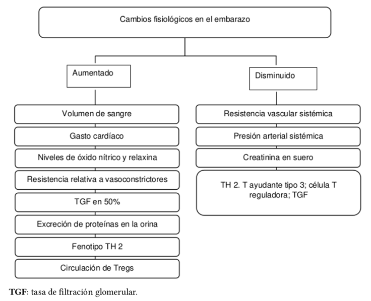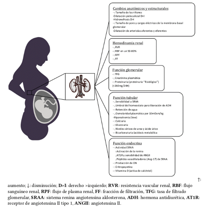 Durante el embarazo ocurren un sin número de cambios dinámicos y adaptaciones renales que tienen como protagonista el riñón y que contribuyen a modificaciones anatomofisiológicas de la madre y el feto3; en la Figura 1 se observan algunos de estos cambios.