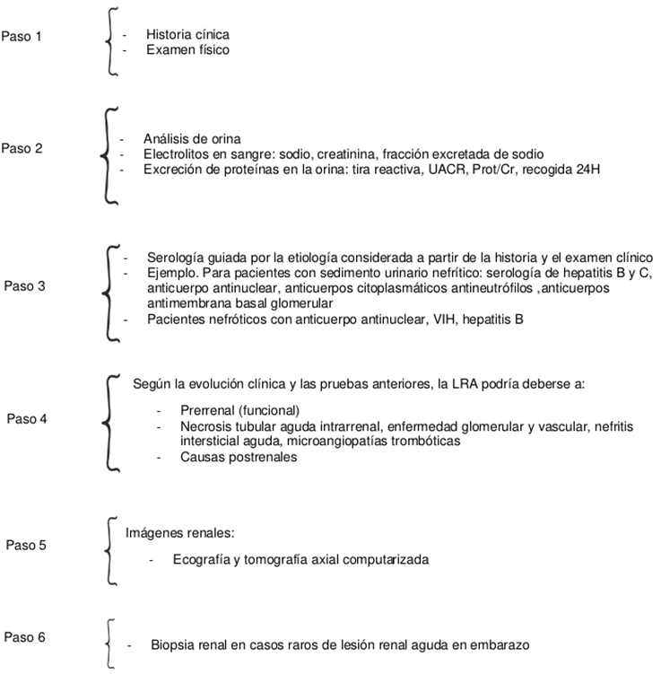 El diagnóstico oportuno de Emb-LRA se basa en una historia clínica completa y en pruebas de laboratorios complementarias. Es importante que a todas las mujeres embarazadas con sospecha diagnóstica de Emb-LRA se les monitoree de forma metódica el ingreso y egreso de líquidos, además se les deben evaluar los niveles de urea, creatinina, electrolitos, hemograma, uroanálisis y pruebas de función hepática como parte del estudio inicial. Los pasos para el enfoque inicial de la paciente con Emb-LRA se resumen en la Figura 3.
