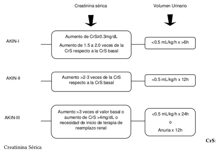 Hay que tener en cuenta que si bien la oliguria puede indicar el desarrollo de LRA, existen determinadas condiciones del embarazo donde esta es una respuesta renal compensatoria a la depleción de volumen intravascular, tal como ocurre en la PE y en otras circunstancias como el dolor23. No obstante, la anuria nunca se puede considerar como normal y se debe tratar como una emergencia23. En la Figura 4 se pueden observar los criterios diagnósticos de AKI aplicables para población general; sin embargo, diversos estudios han demostrado que la mayoría de los casos de Emb-LRA pertenecen a la categoría de estadio 1 de AKIN y que una categoría RIFLE más alta se asocia con peores resultados.